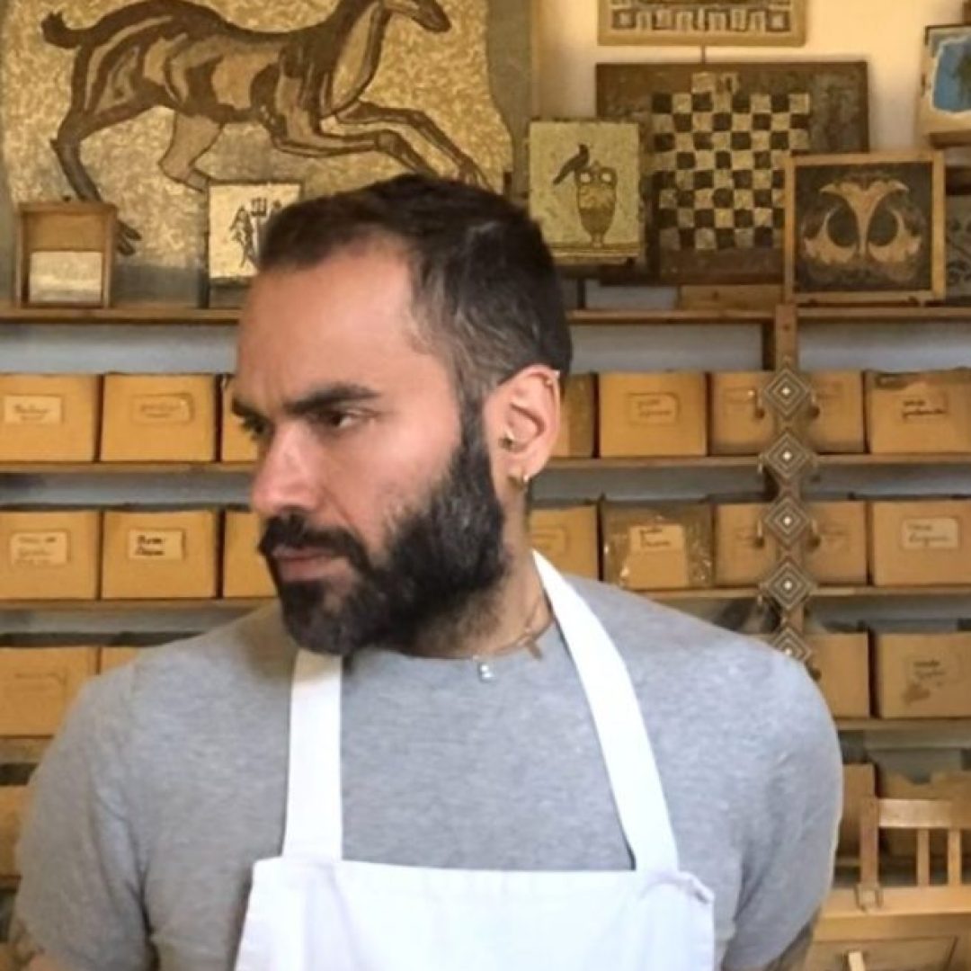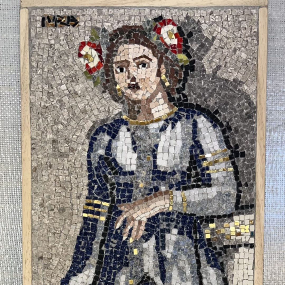 He holds a degree in Visual Arts and Multimedia Production and creates works inspired by Roman mosaic tradition, reinterpreted through a contemporary lens that blends technique, symbolism and design.