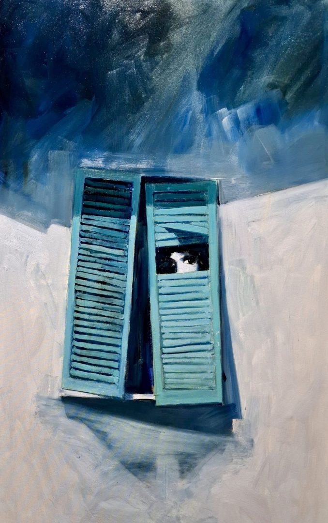 La pace non è sempre un silenzio limpido o un orizzonte aperto. A volte si nasconde dietro una finestra socchiusa, come in questo dipinto: una ragazza osserva il mondo da dietro delle persiane azzurre, lasciando intravedere solo i suoi occhi. Non si mostra del tutto, non si espone. Eppure, proprio in quel gesto, sembra custodire qualcosa di prezioso. Il suo sguardo è vigile, ma non agitato. È come se avesse scelto di restare in disparte per proteggere la propria quiete interiore. Fuori c’è il cielo, vasto e irregolare, pieno di movimento e incertezza; dentro, invece, c’è uno spazio raccolto, intimo, dove il rumore del mondo arriva attenuato.