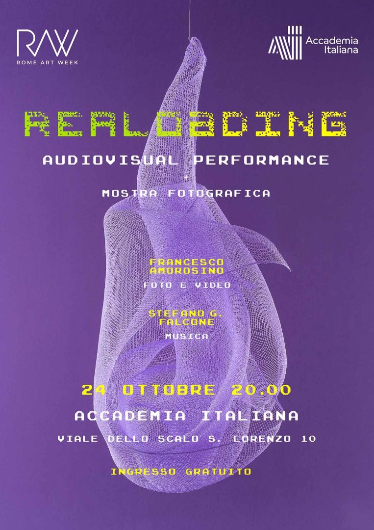 A live audiovisual performance in which the virtual and real worlds blend and nothing is what it seems. With artist Francesco Amorosino creating the visuals and composer Stefano G. Falcone on the music, Realoading is an immersive experience that invites audiences to observe our world in a new way. The performance, presented here for the first time, is accompanied by an exhibition of photographs by Amorosino.