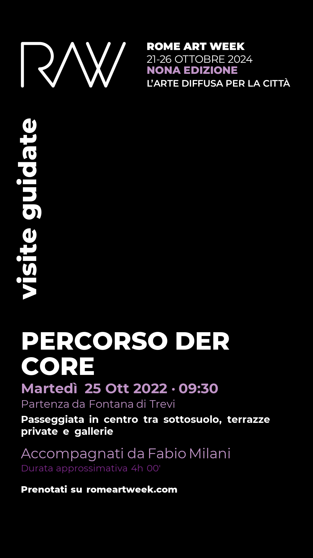 Il percorso prevede la visita di: Bat-Gallery, sorpresa, Terrazza panoramica, Terrazza Pantheon, sorpresa, Galleria del Cembalo, Galleria Emmeotto, Casa editrice, Galleria Lombardi, Cortile di Palazzo Sforza Cesarini, sorpresa.