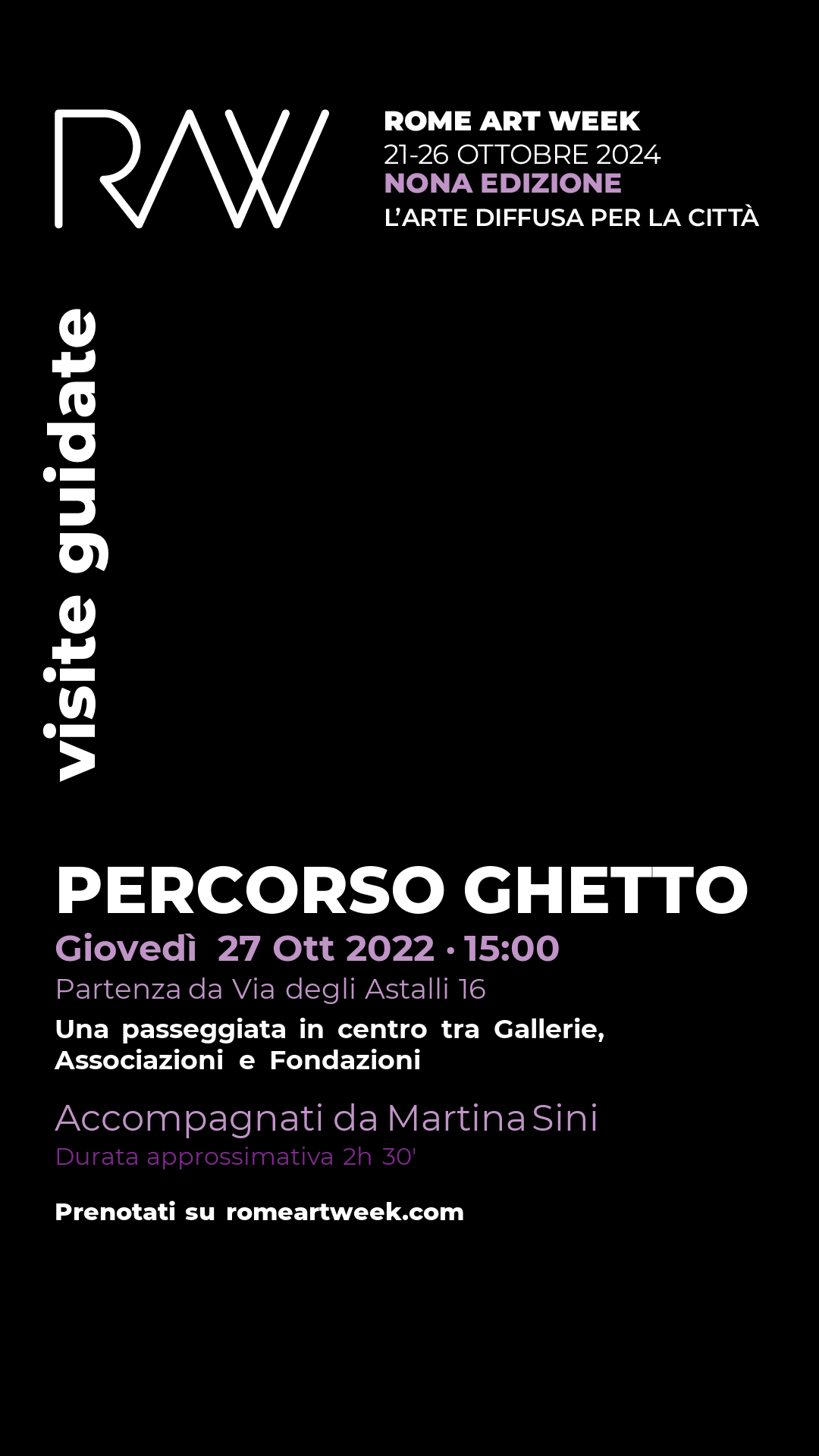 Passeggiata tra le meraviglie dei Rione Sant'Angelo la cui visita prevede: Galleria Art G.A.P, Galleria Bibliothè Art Gallery, Associazione culturale C.R.E.T.A per l'arte e la ceramica, Fondazione MAGIS Movimento e Azione dei Gesuiti Italiani per lo Sviluppo, Galleria Anna Marra e lo studio dell'artista Victoria Thomen.