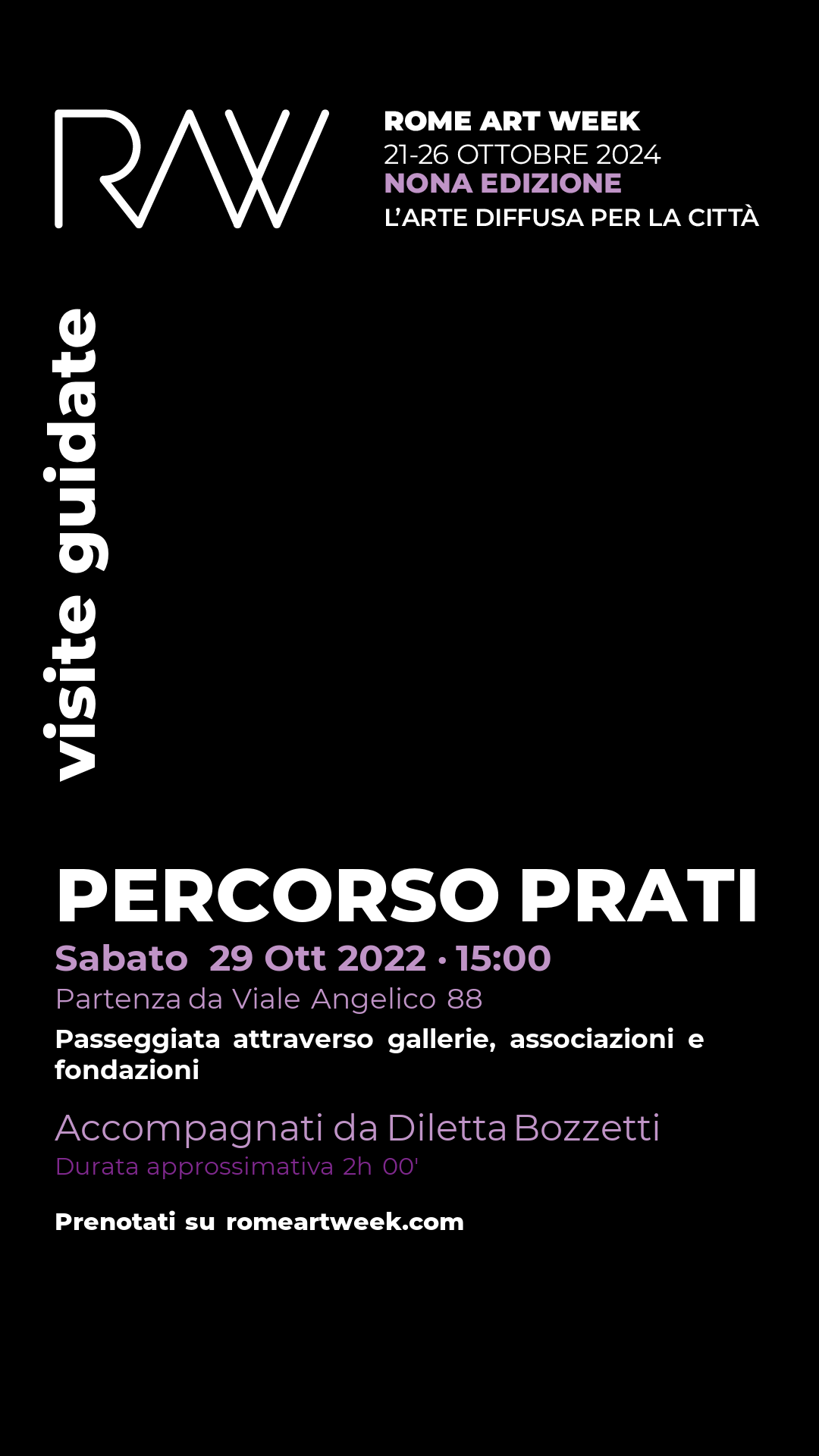 Passeggiata tra le meraviglie dei Quartiere Prati la cui visita prevede: Spazio espositivo Otto Gallery, Fondazione Cervelli Ribelli Onlus, Associazione culturale l'ESPRESSIONE, Associazione culturale Il Salotto di Diotima, al caffè Quintessenza e lo studio dell'artista Michel Patrin.
