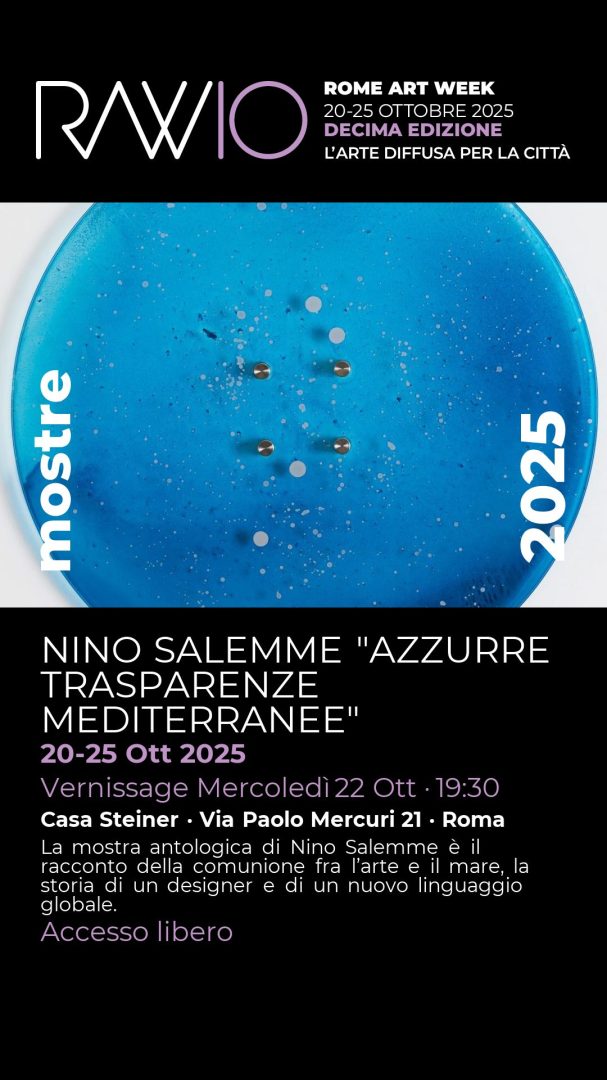 La mostra antologica di Nino Salemme è il racconto della comunione fra l’arte e il mare, la storia di un designer e di un nuovo linguaggio globale. Accesso libero Vernissage Mercoledì 22 Ott 2025 | 19:30-21:30