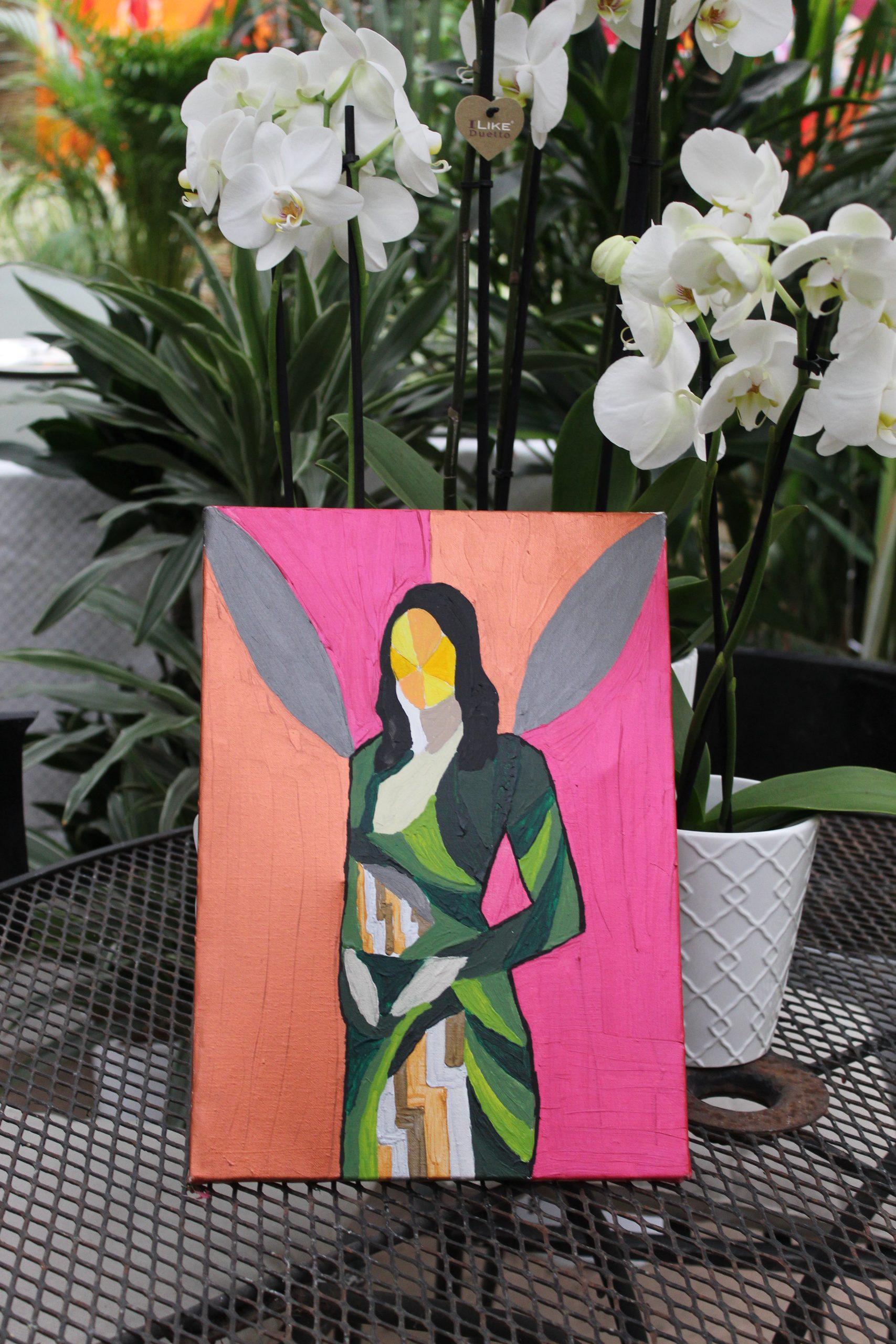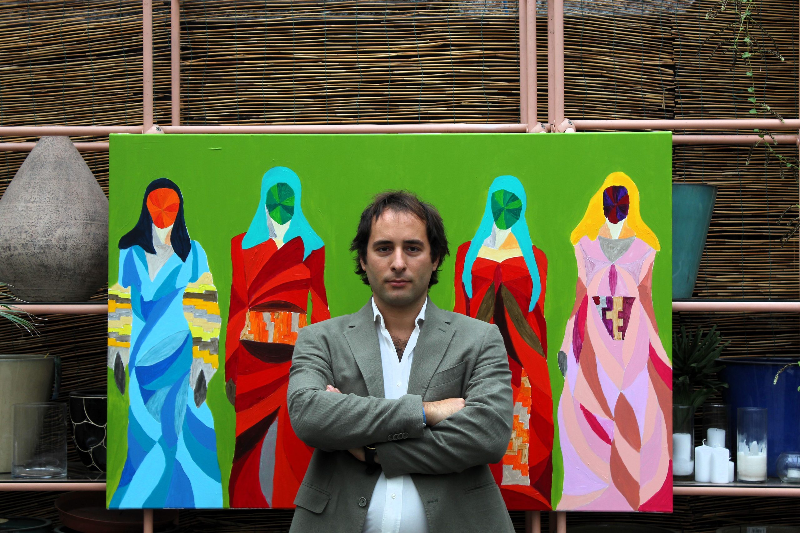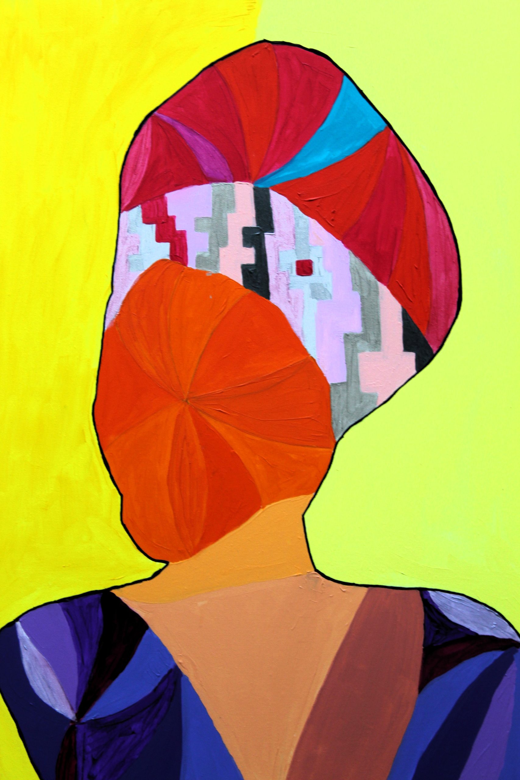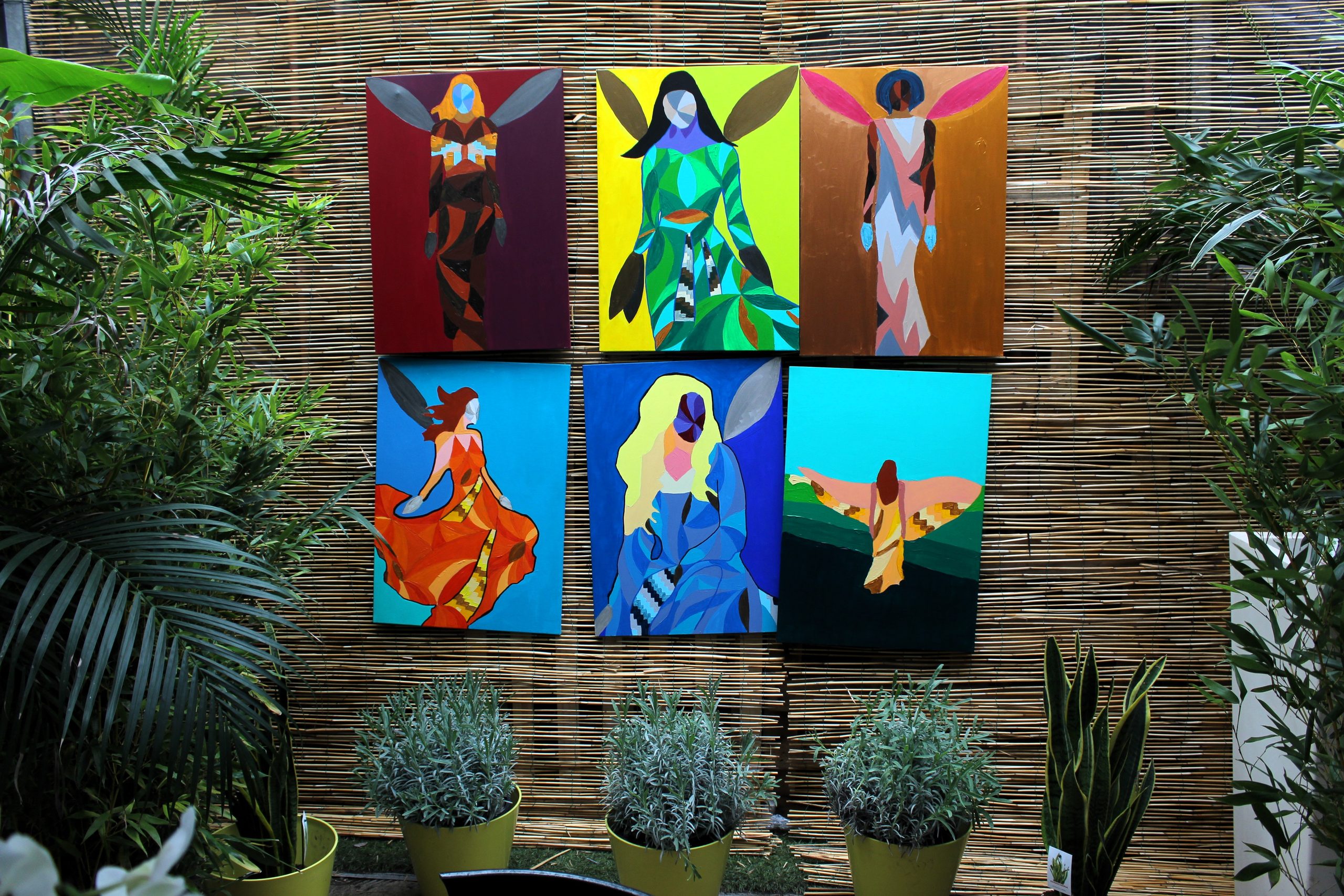 Tali dipinti si distinguono per una sintassi visiva netta e dinamica: figure femminili senza volto, avvolte in campiture cromatiche pure, in cui la geometria si fa linguaggio simbolico. La struttura del corpo è scomposta in moduli poligonali e cromie sature — verdi, rossi, ocra, blu — che evocano una dimensione quasi liturgica. Le forme sintetiche e la frontalità ieratica rimandano a una figurazione arcaica, ma restituita attraverso un codice visivo pienamente contemporaneo, dove astrazione e figurazione convivono come due principi vitali in tensione.