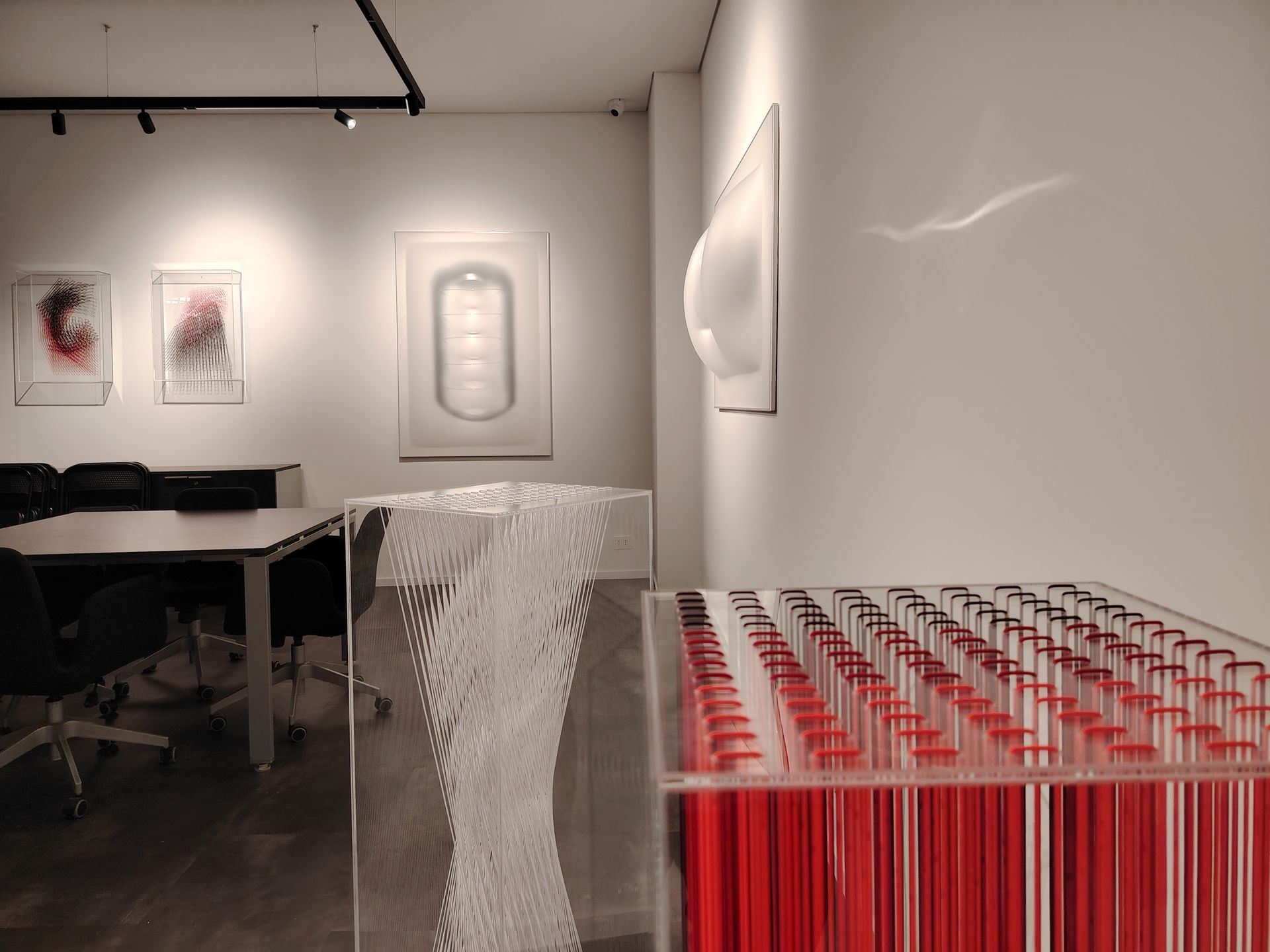 Con lo spazio architettonico le opere di Emanuela Fiorelli dialogano e cercano la relazione intessendo trame che lo sollecitano e ne modificano la percezione. Progressive variazioni ritmiche di una riscrittura geometrica - e poetica – del contesto che induce l’osservatore al movimento, generando movimento. All’interno e attraverso lo spazio oggettivo, lo stato tensionale delle corde sottili che compongono l’opera disegna la vibrante ossatura di volumetrie aeree permeabili allo sguardo.