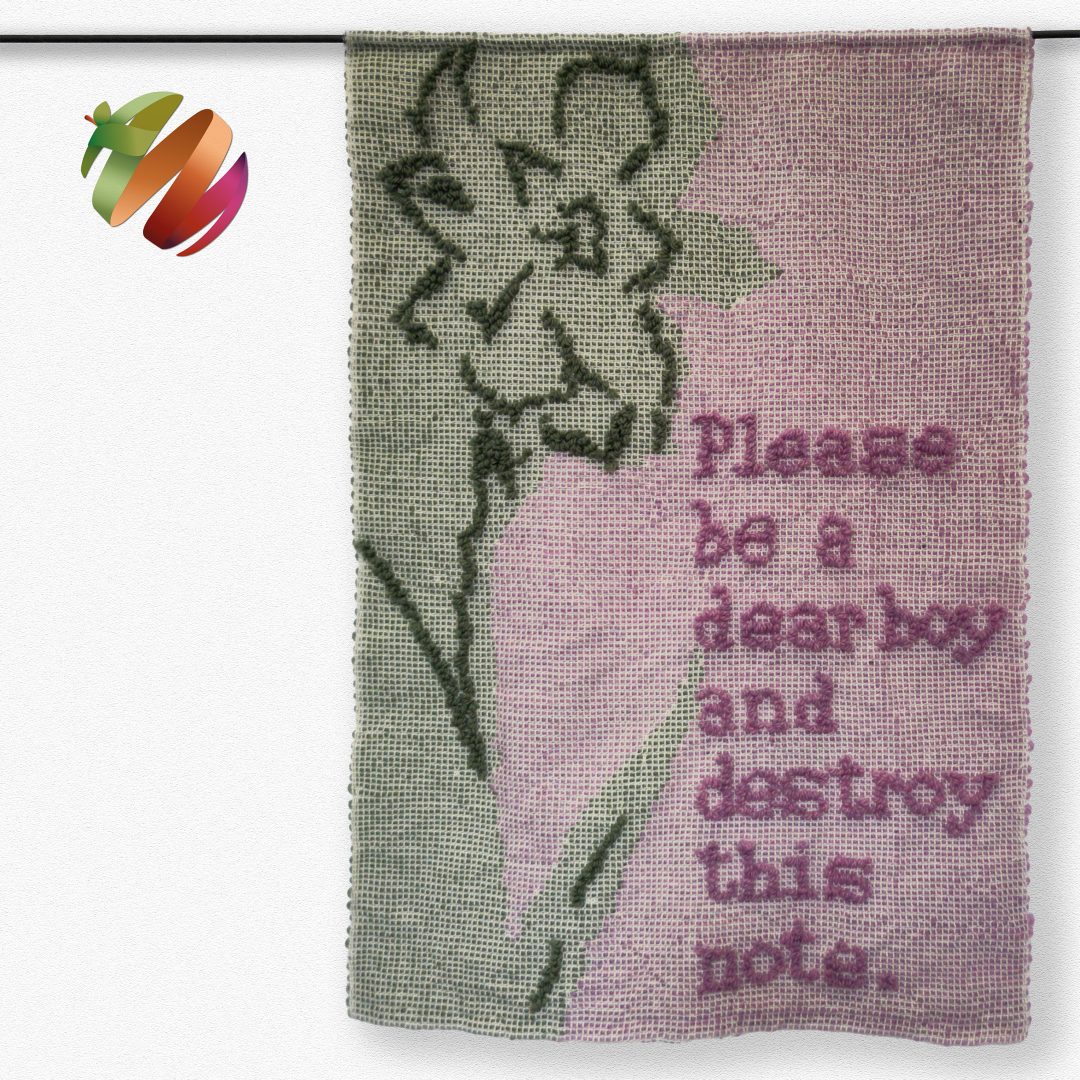 Crediti immagine: Claudio Proietti, Please be a dear boy and destroy this note, tessitura a pibiones, 50 x 80 cm, lana e cotone.