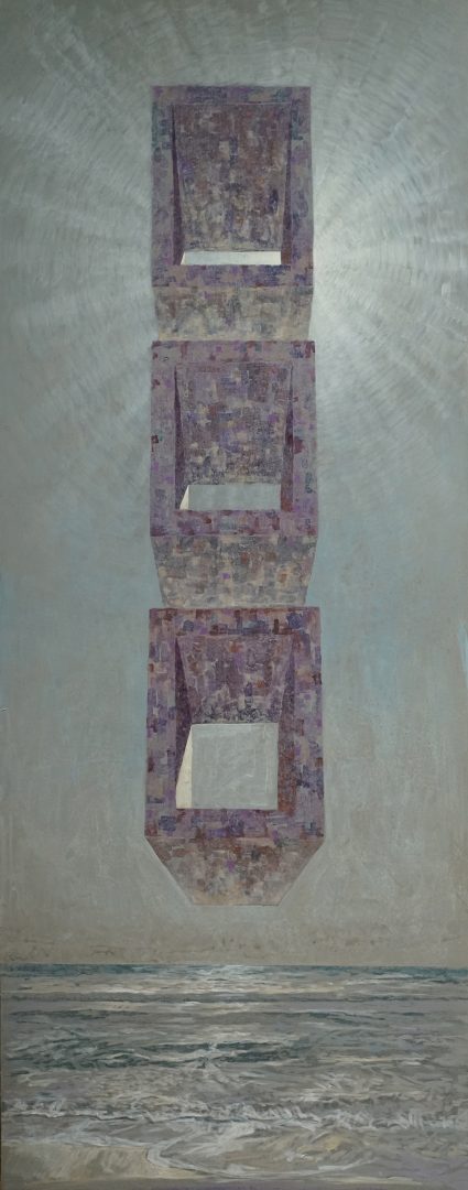 La pittura di Campese, profondamente consapevole delle lezioni dei Maestri del passato, si inoltra oltre la rappresentazione del reale per indagare forme archetipiche: monoliti, portali, strutture ciclopiche che evocano luoghi sacri, soglie di passaggio verso dimensioni più intime, più alte. Una ricerca del “divino”, come l’artista stesso afferma, che prende forma attraverso costruzioni senza tempo, mai concluse, che esistono al confine tra terra e cielo, tra idea e materia.